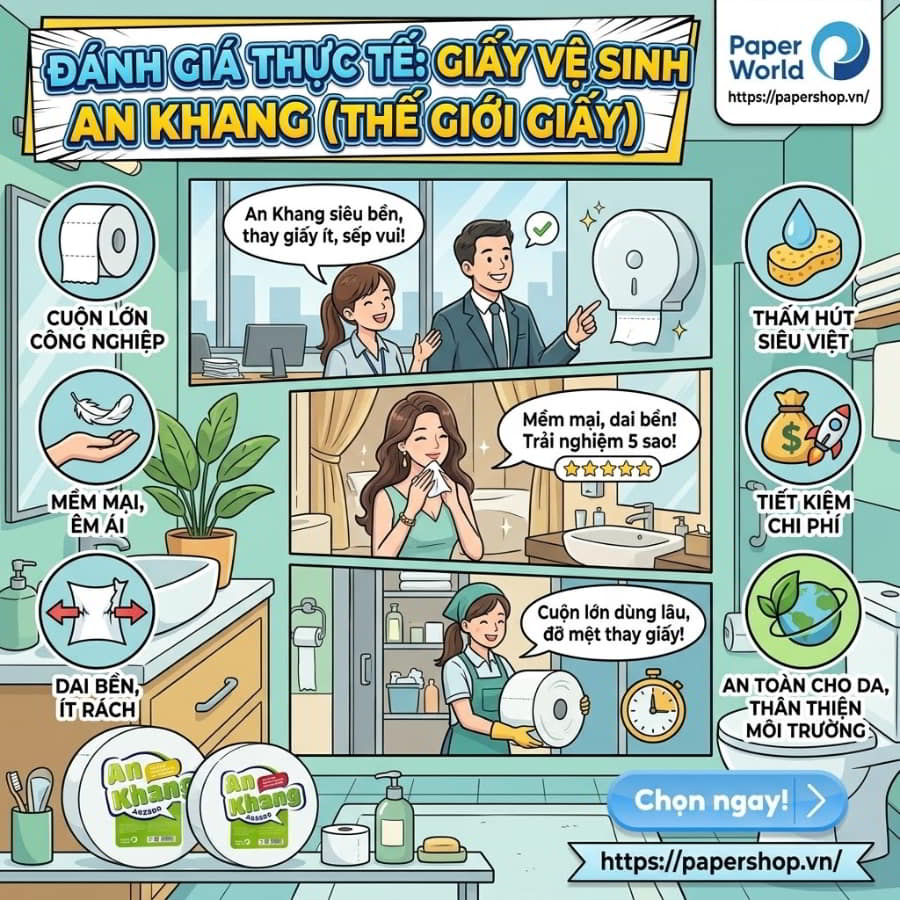 Người dùng thực tế tại các doanh nghiệp, khách sạn hay khu công nghiệp cho biết giấy 2 lớp và 3 lớp của Thế Giới Giấy mang lại trải nghiệm tốt, ít phải thay cuộn, giúp tiết kiệm chi phí vận hành và nâng cao tính chuyên nghiệp cho không gian vệ sinh.
